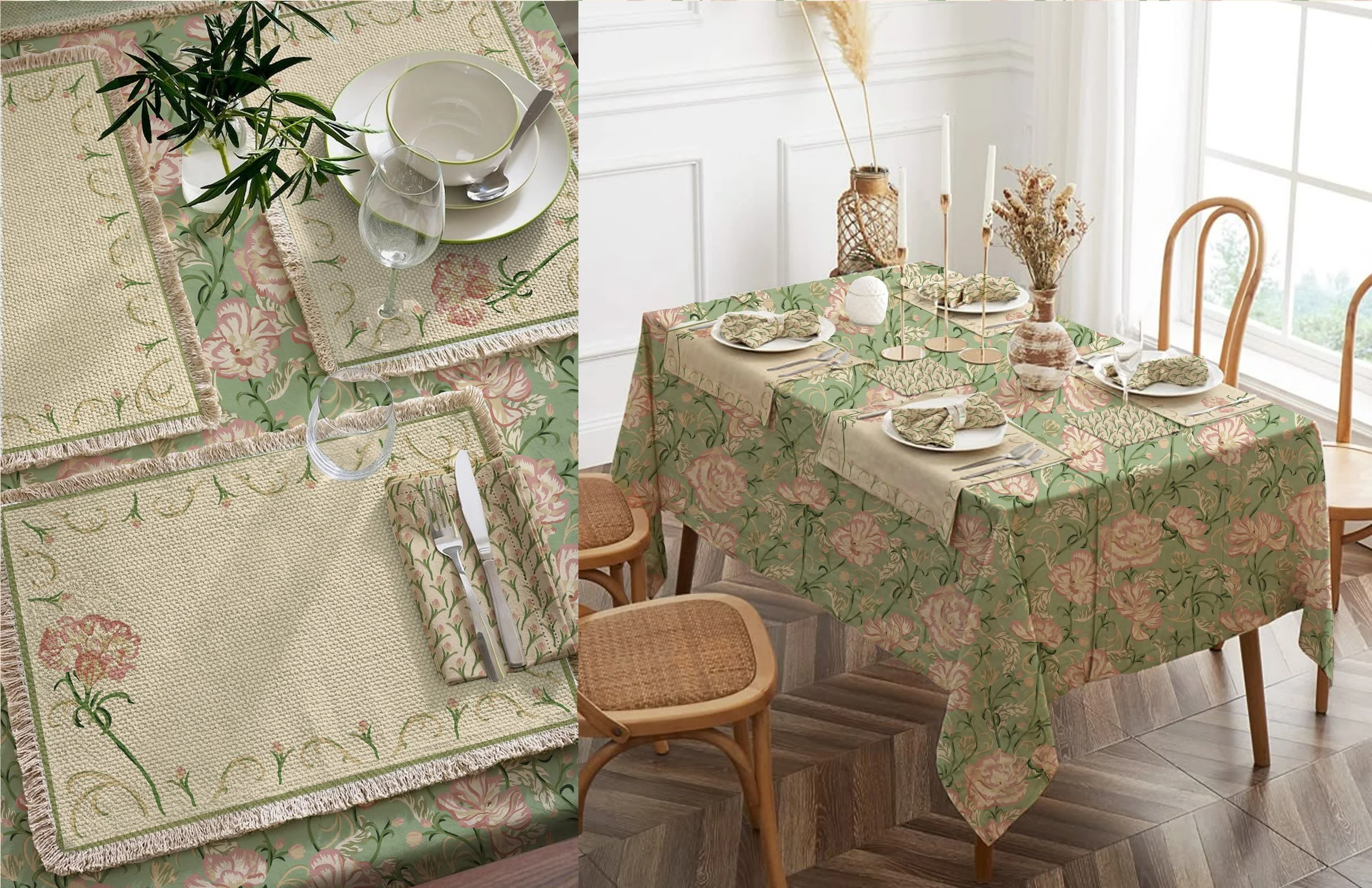 Table linens collection featuring a traditional floral inspired by Art Nouveau